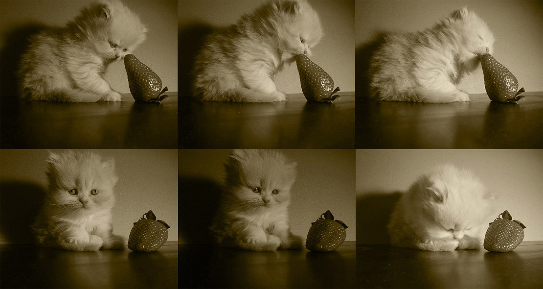 В верхней части фотографии (3 фото) маленькая и пушистенкая кошечка, которая из-за своего любопытства сначала трогает лапкой, потом нюхает, и только в самом конце пробует на вкус.
